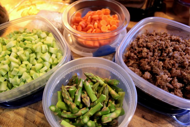 Chop a variety of veggies into bite size cubes and store in airtight containers in the fridge. Don’t throw away your broccoli stems, either! These have become one of my most favorite additions to breakfast. Chop ’em up and add ’em in.