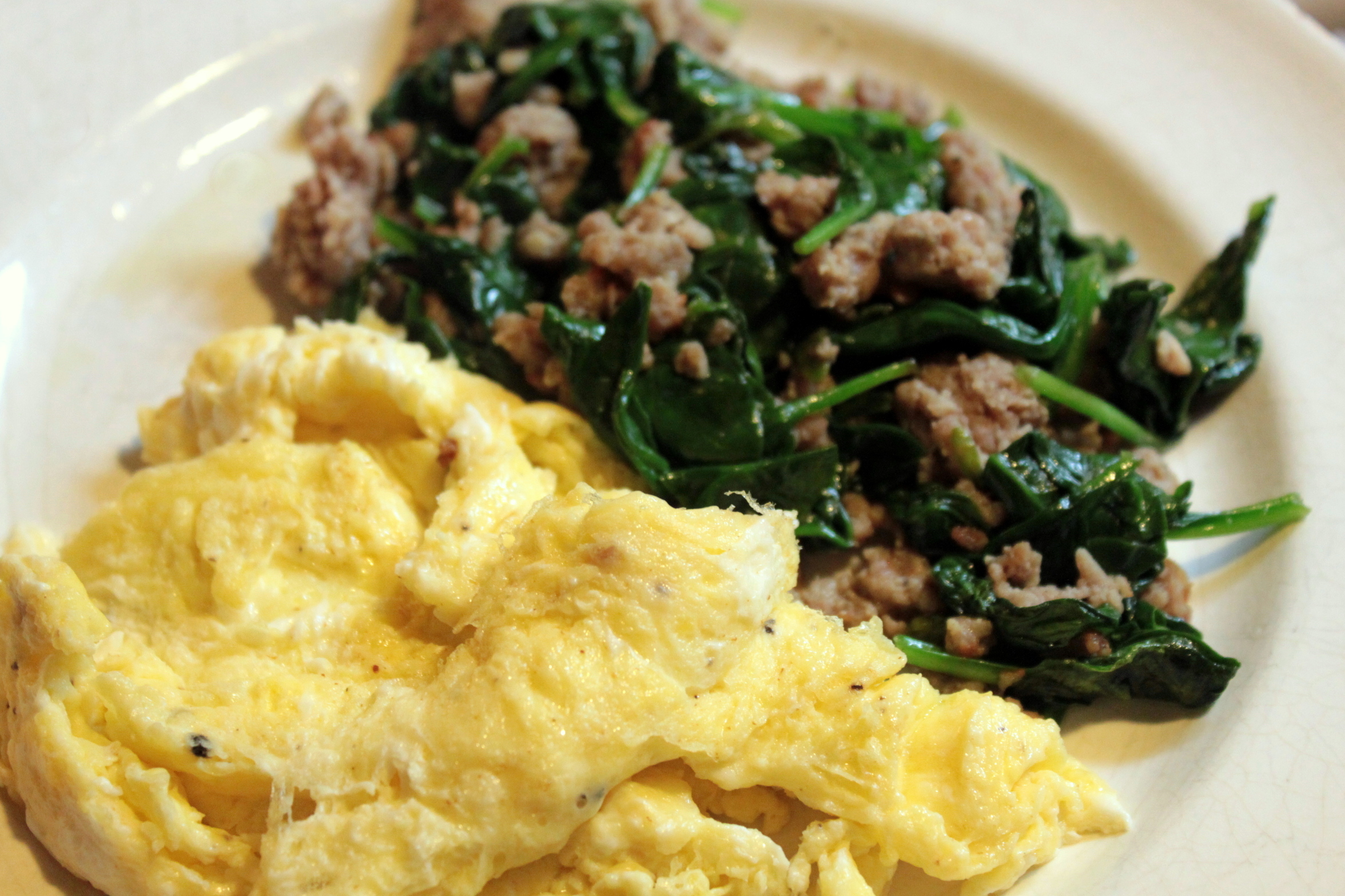 Throw some veggies into a pan over med to med-high heat with a little coconut oil or a pat of pastured butter, let them get slightly soft, add in some of the browned meat and then toss in the eggs and cook until done. I stir it all so it is like a big scramble, but you could just let the eggs set up in the pan and have a giant omelet.