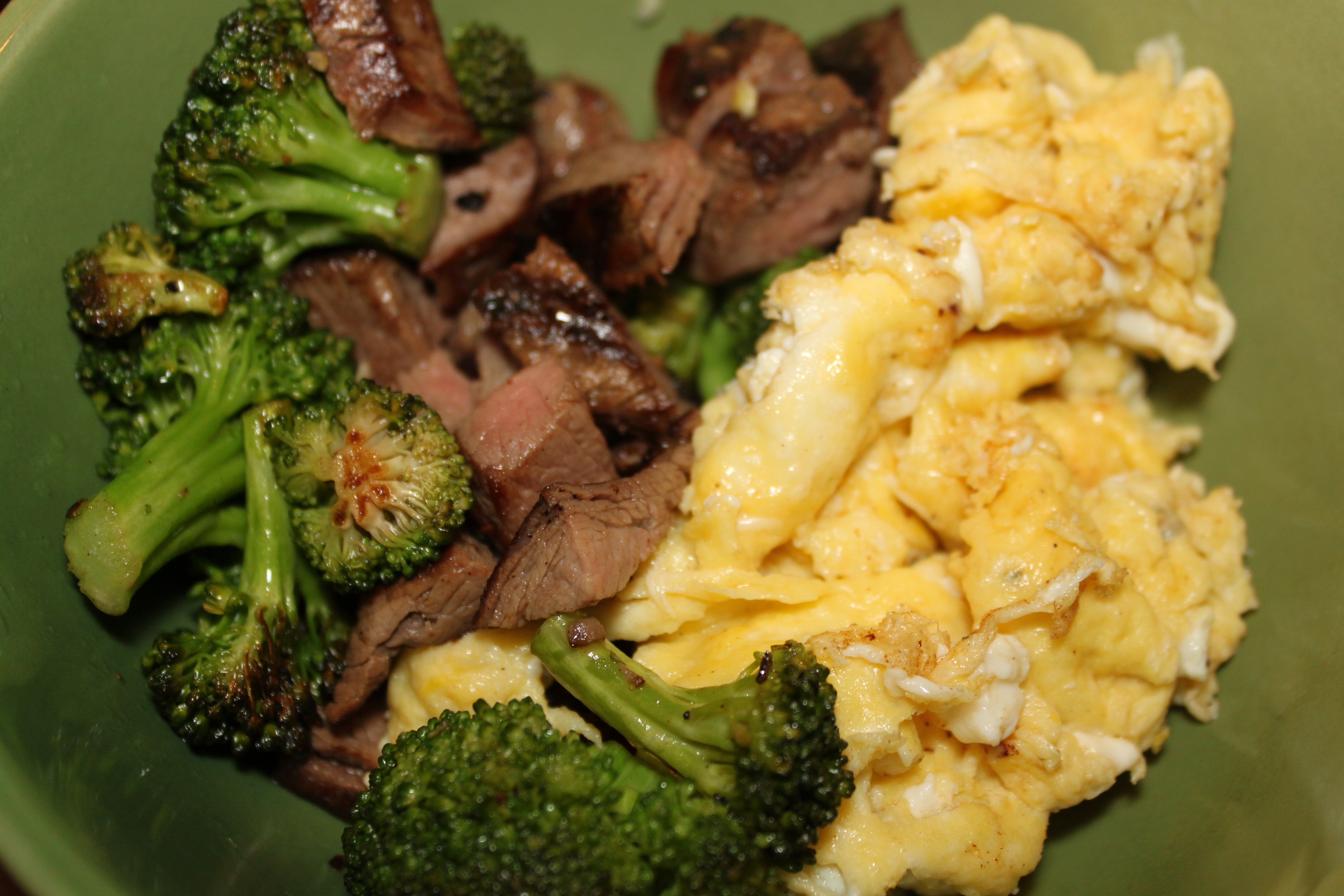 Once you start doing this, you will get the hang of it and realize you can make breakfast out of almost anything! When all else fails and you have not prepped any veggies or meat, use leftovers! Two nights ago I had a filet and broccoli for dinner but did not eat it all, so it became breakfast today!